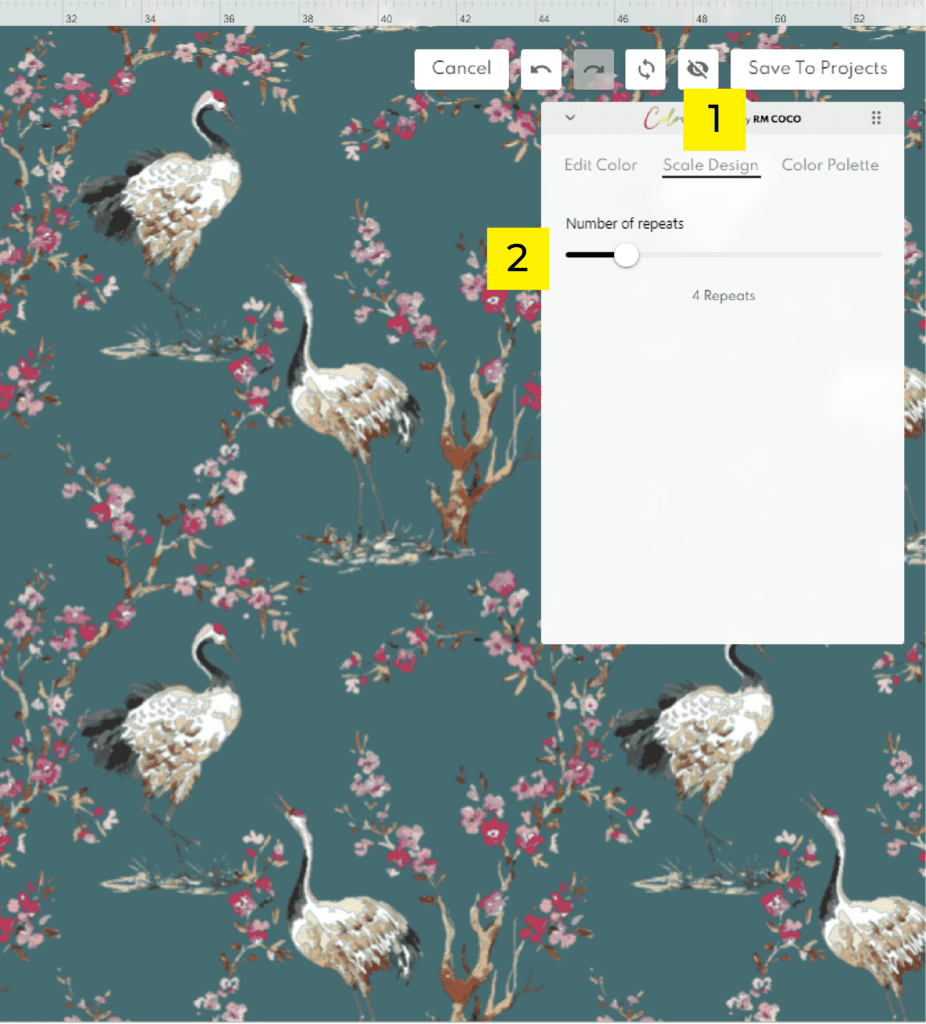 2. Use the slider to adjust the number of repeats This is the number of horizontal repeats per the width (54”)