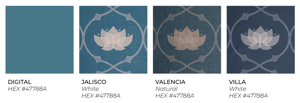 Using HEX# 47788A from our ColorWorks™ Color Palette as an example, you can see the color difference across the different substrates emphasizing the importance of this selection.